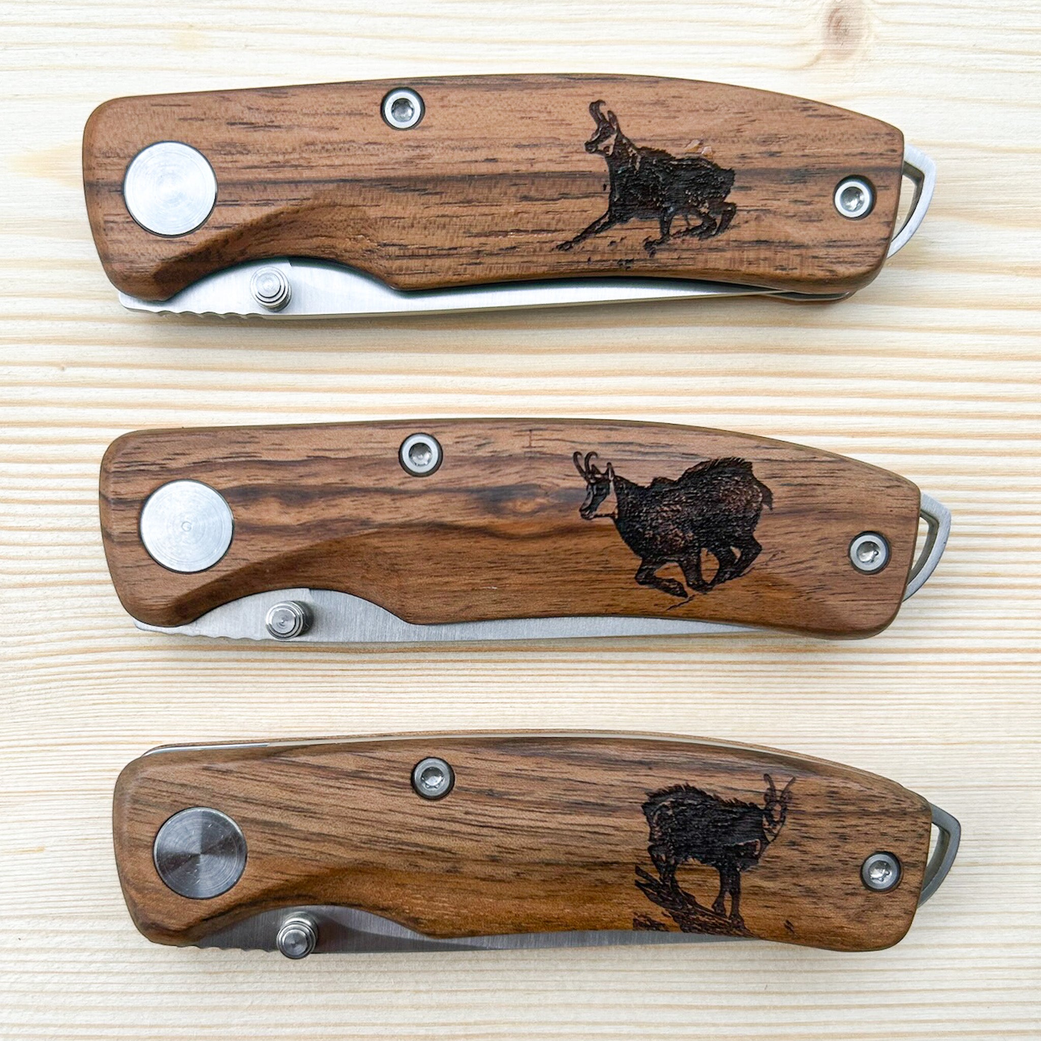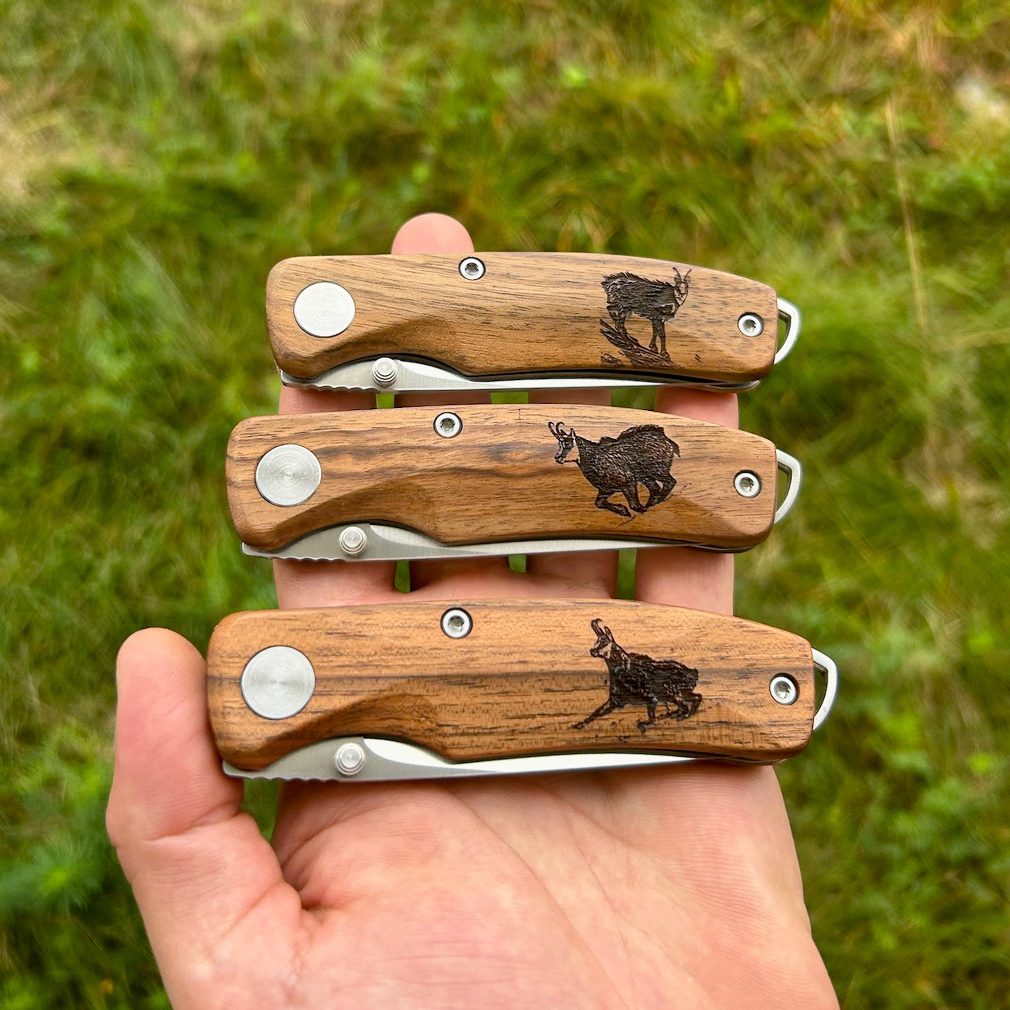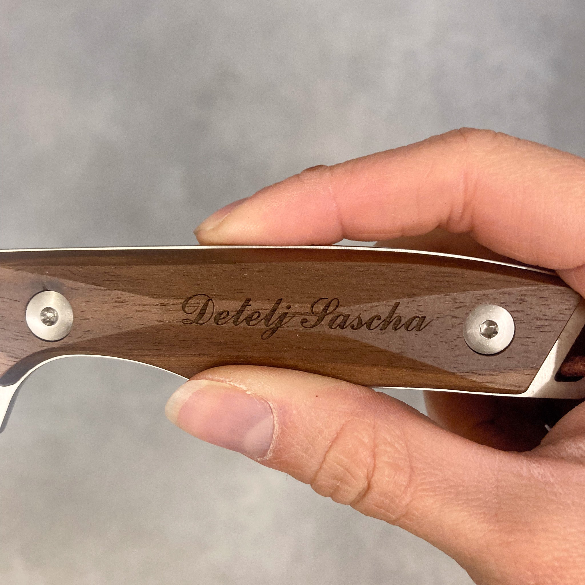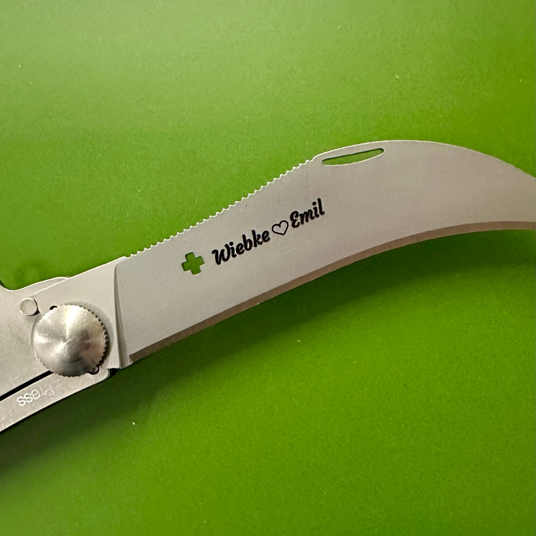 Wenn du dein Messer noch exklusiver gestalten möchtest, können wir auch Logos oder individuelle Designs gravieren. Dies ist der ideale Service für Firmenpräsente, Werbeartikel oder um besondere Anlässe zu feiern. Dank der Präzision unserer Lasertechnologie können wir auch die komplexesten Details reproduzieren und ein wirklich einzigartiges Ergebnis erzielen.