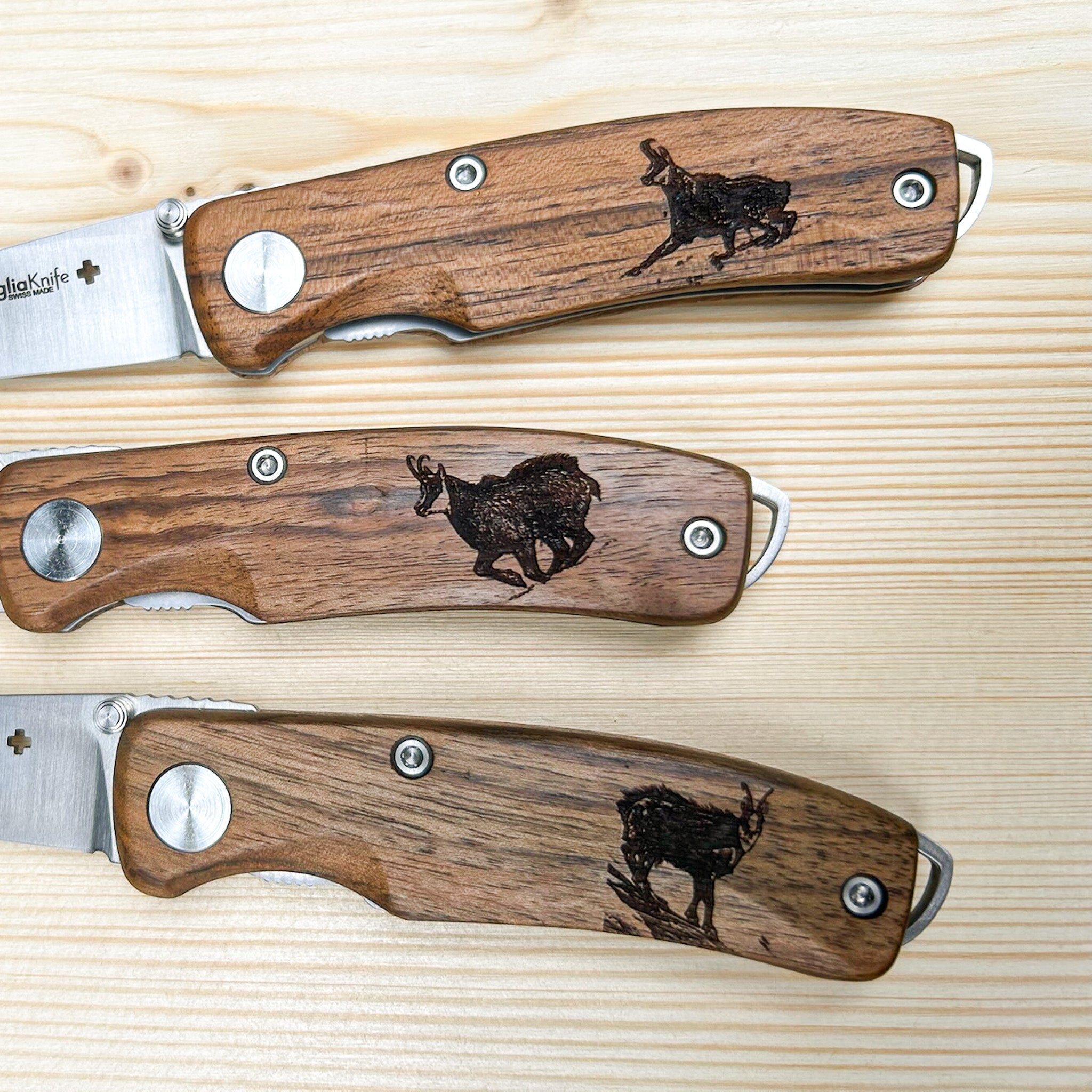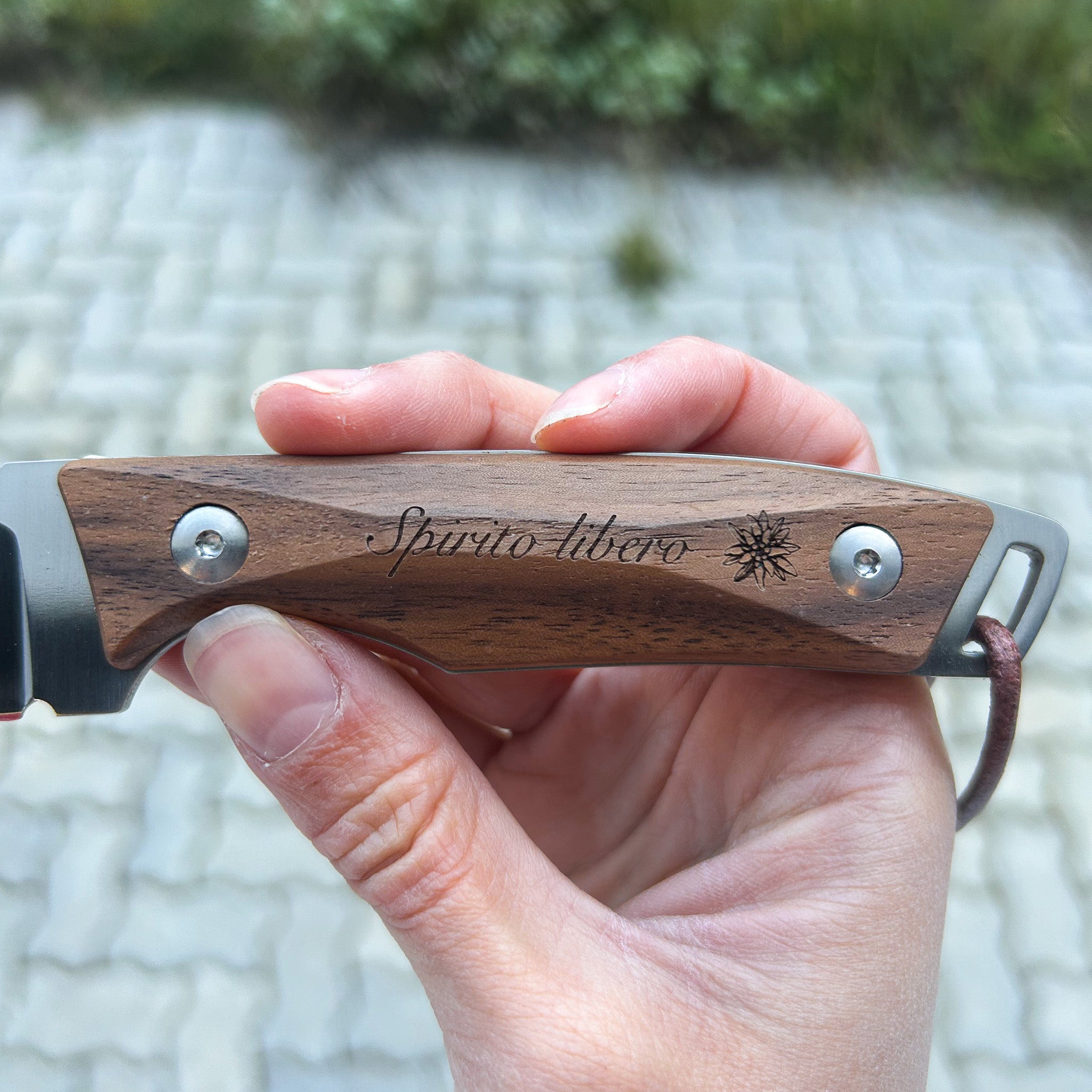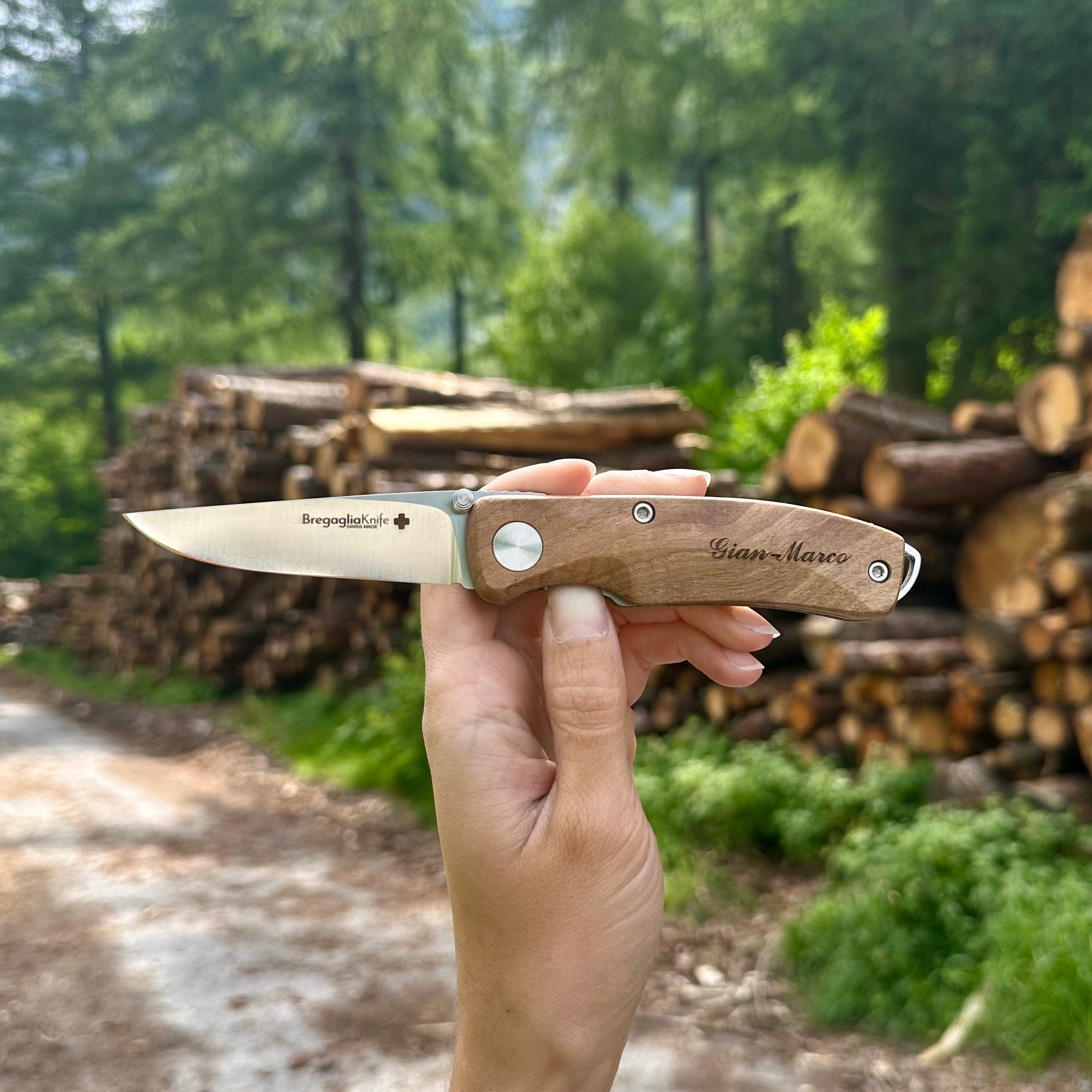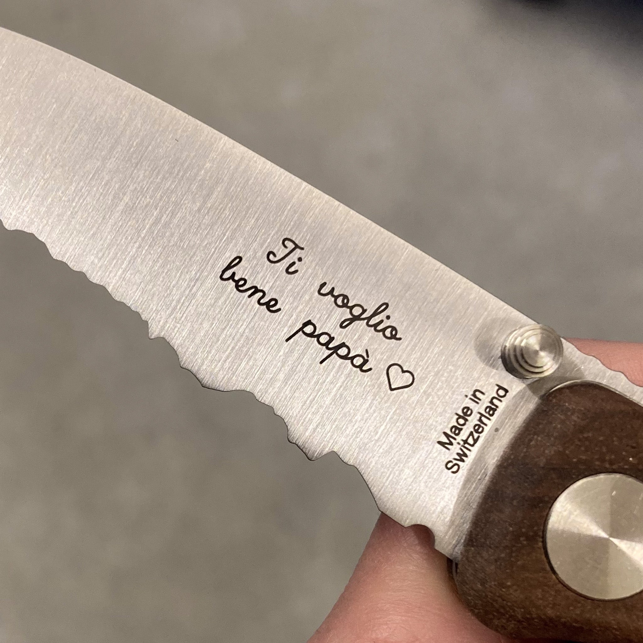 Wir bei Bregagliaknife glauben, dass jedes Messer einzigartig sein kann. Aus diesem Grund bieten wir den Service der Lasergravur an. Du kannst personalisierte Gravuren auf dem Griff oder der Klinge hinzufügen, und das Hinzufügen von Schriftzügen ist bei jedem Messer kostenlos. Eine perfekte Gelegenheit, dein Produkt noch spezieller zu machen, ohne zusätzliche Kosten.
